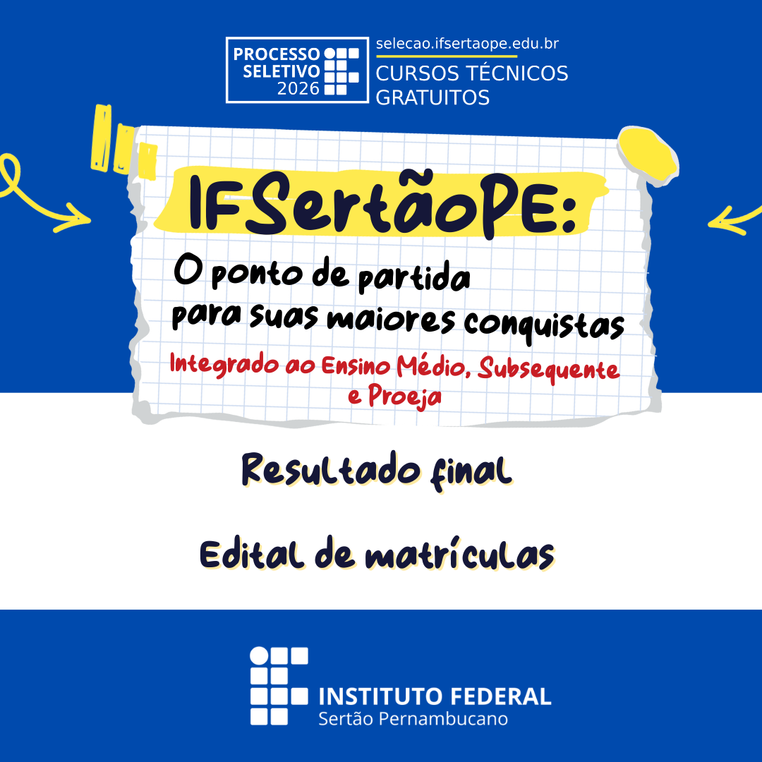 O Instituto Federal do Sertão Pernambucano (IFSertãoPE) divulgou, nesta segunda-feira (22), o resultado final do processo seletivo 2026 para os cursos técnicos da instituição. O processo foi regido pelos editais nº 101 e 102/2025 e disponibilizou vagas em cursos nas modalidades Médio Integrado, Subsequente e Proeja, para todas as unidades do IFSertãoPE. Também foram publicados os editais de matrícula e os…