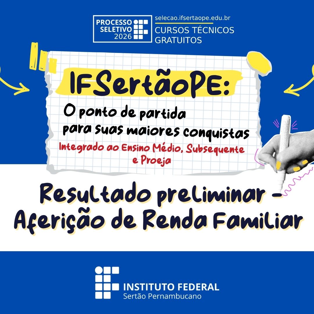 A comissão responsável pelo Processo Seletivo 2026 para cursos técnicos do Instituto Federal do Sertão Pernambucano (IFSertãoPE) informa que já está disponível na área logada dos candidatos o resultado preliminar da etapa Aferição de Renda Familiar. Os interessados em interpor recursos poderão enviá-los nos dias 18 e 19 de novembro. Para interpor recurso contra o Resultado Preliminar de Renda Familiar,…