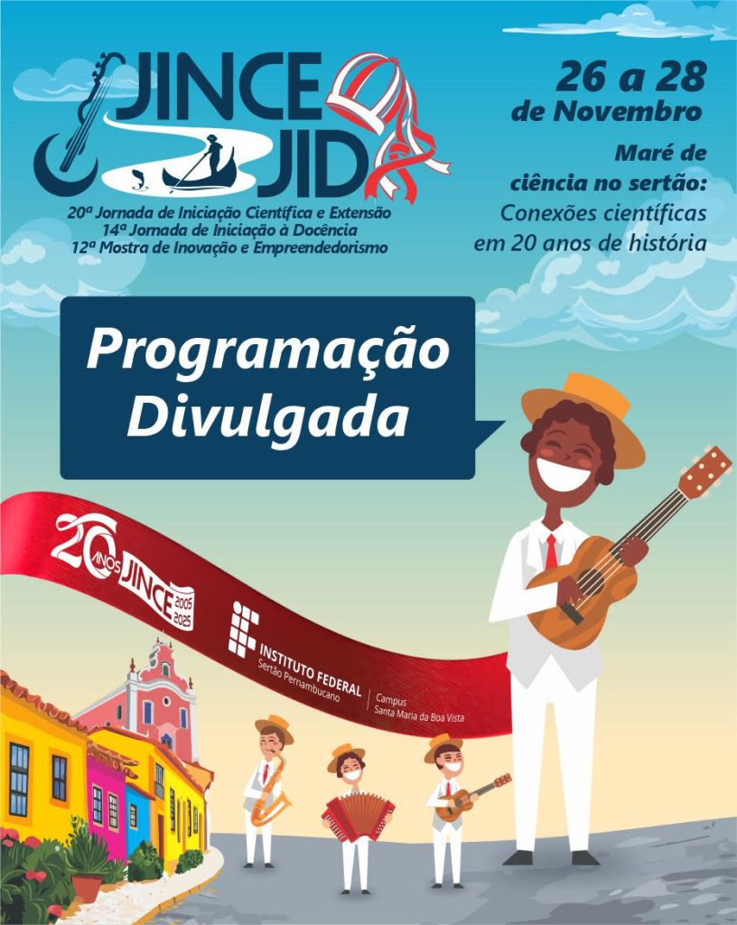 Cartaz de divulgação do evento JINCE (Jornada de Iniciação Científica e Extensão), comemorando 20 anos (2005-2025). Título do Evento (no topo): JINCE JID 20ª Jornada de Iniciação Científica e Extensão 14ª Jornada de Iniciação à Docência 12ª Mostra de Inovação e Empreendedorismo Data: 26 a 28 de Novembro Tema: Maré de ciência no sertão: Conexões científicas em 20 anos de história Mensagem Central: Programação Divulgada (em uma caixa de texto azul escura) Organização/Local: INSTITUTO FEDERAL Sertão Pernambucano Campus Santa Maria da Boa Vista Elementos Visuais: A imagem apresenta uma cena festiva e cultural com foco na região do sertão. No canto inferior direito, há uma figura principal sorridente, de pele morena, usando chapéu de palha e roupa branca com gravata vermelha, tocando um violão. Abaixo dele, há três músicos mascarados: um tocando sanfona e dois tocando instrumentos de sopro/corda (um cavaquinho ou similar e um instrumento de sopro). À esquerda, há uma rua colorida com casas típicas, e ao fundo, uma igreja ou prédio histórico em tons de rosa e laranja. Uma fita vermelha atravessa a imagem, com o logo de 20 ANOS JINCE 2005 2025.
