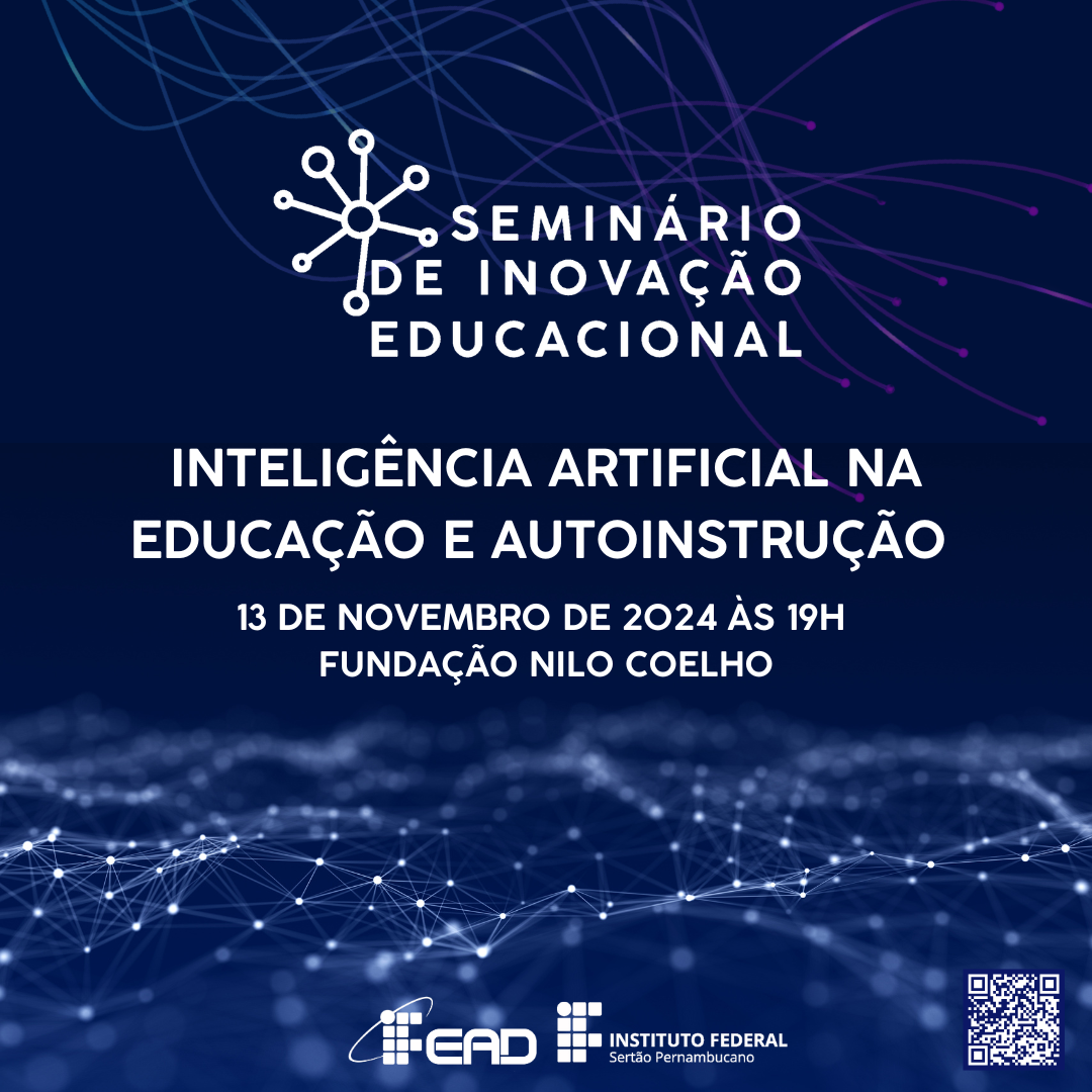 A Diretoria de Educação a Distância (DEaD) do Instituto Federal do Sertão Pernambucano (IFSertãoPE), em parceria com os colegiados dos cursos a distância, vai realizar o Seminário de Inovação Educacional. O evento ocorrerá no dia 13 de novembro (quarta-feira), às 19h , com o tema “Inteligência Artificial na Educação e Autoinstrução”. O objetivo é promover discussões sobre estratégias de ensino que utilizam inovações tecnológicas e inteligências artificiais disponíveis no mercado.