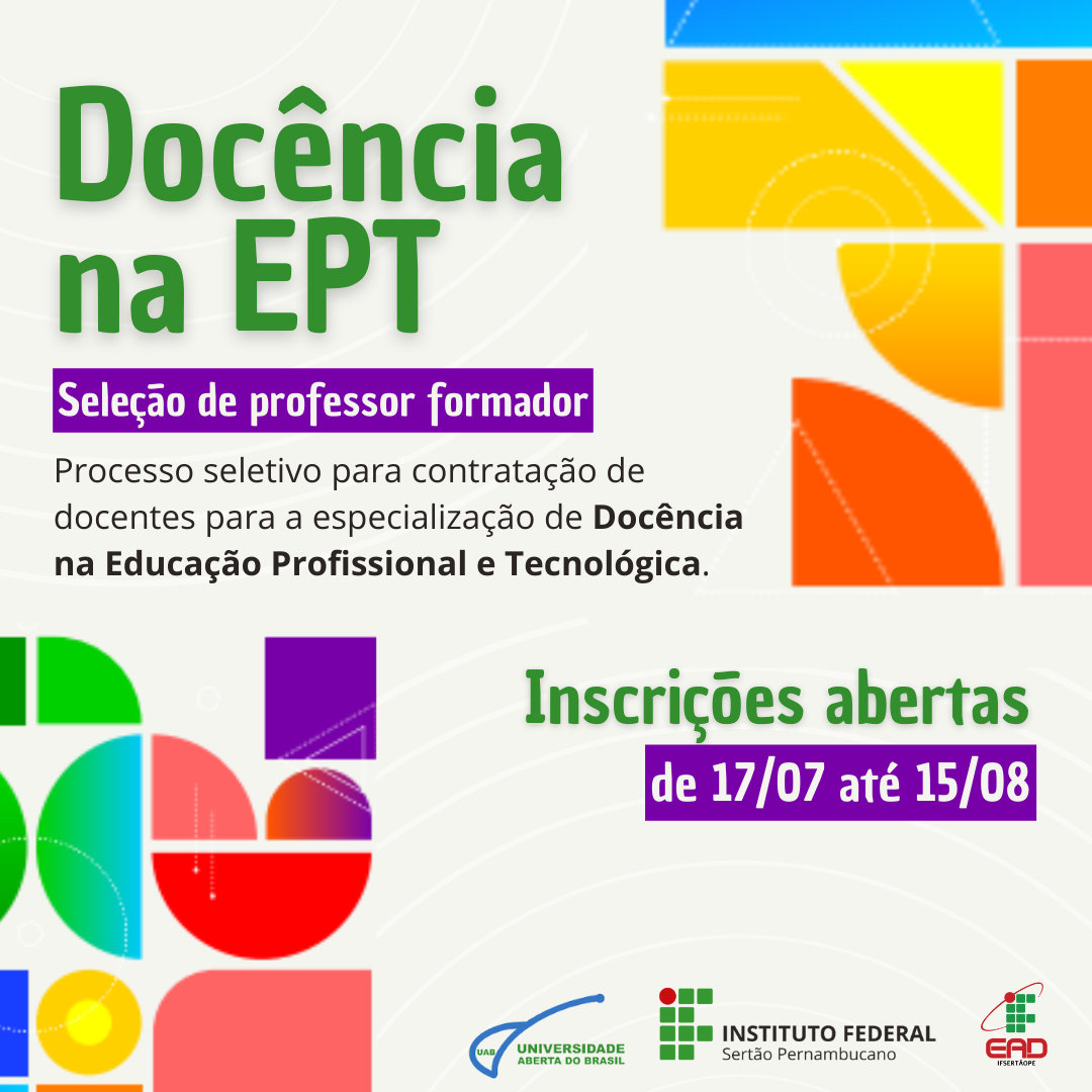 A Diretoria de Educação a Distância (DEaD) do Instituto Federal do Sertão Pernambucano (IFSertãoPE) anunciou, hoje (15), a abertura do processo seletivo para professor formador do curso de pós-graduação em Docência na Educação Profissional e Tecnológica (Docência na EPT). A especialização é resultado de uma parceria entre o IFSertãoPE e o programa Universidade Aberta do Brasil (UAB). A seleção é restrita aos docentes concursados do quadro da Instituição, sendo admitida a participação de professores externos em casos de não preenchimento das vagas.