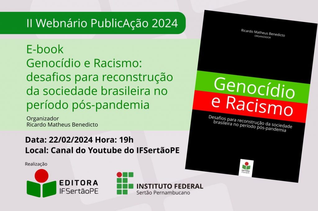 A Editora do Instituto Federal do Sertão Pernambucano (IFSertãoPE), em parceria com a Associação Brasileira de Pesquisadores(as) Negros(as), realizará, ao longo desta semana, o lançamento de duas novas obras digitais sob a sua chancela. Nesta primeira edição do Webinário PublicAção 2024, evento promovido pela Editora IFSertãoPE, serão lançados dois livros digitais escritos e organizados por docentes e pesquisadores da instituição, que tiveram os seus trabalhos apresentados e reconhecidos no XII Congresso de Pesquisadores e Pesquisadoras Negras e Negros (Copene).