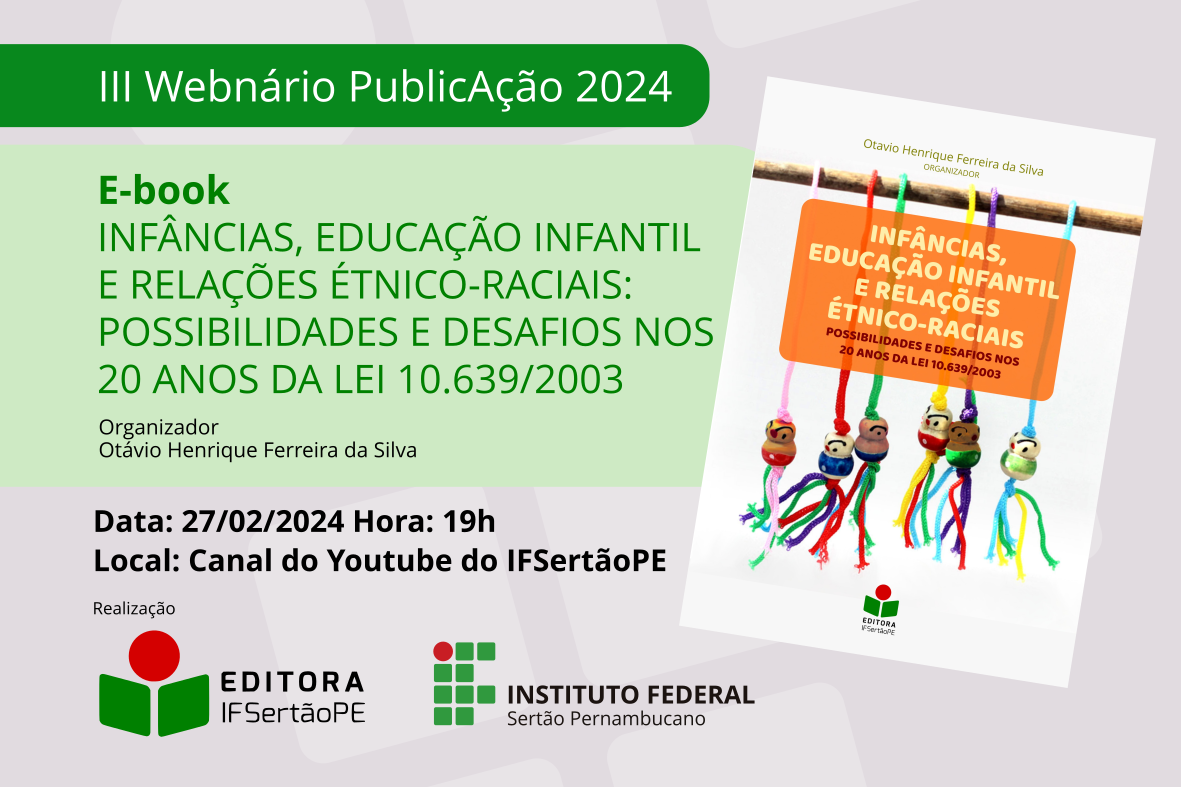 A Editora do Instituto Federal do Sertão Pernambucano (IFSertãoPE), realizará, ao longo desta semana, o lançamento de duas novas obras digitais. Nesta terça-feira (27), será lançada, em evento aberto ao público em geral e transmitido ao vivo pelo canal do Youtube IFSertãoPE TV Oficial, com início às 19h, a obra “Infâncias, Educação infantil e relações étnico-raciais: possibilidades e desafios nos 20 anos da Lei 10.639/2003”. Será o terceiro Webinário PublicAcão de 2024.
