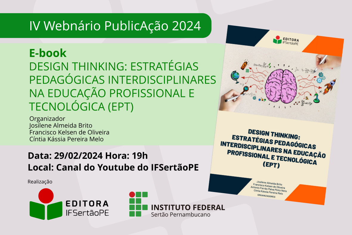 Outra obra que será lançada essa semana, no quarto Webinário PublicAcão do ano, é “Design thinking: estratégias pedagógicas interdisciplinares na educação profissional e tecnológica (EPT)”. Organizado por Josilene Almeida Brito; Francisco Kelsen de Oliveira, Antonio Ferrão Paiva Pinto Neto e Cíntia Kássia Pereira Melo, o e-book apresenta a discussão sobre o uso da metodologia ativa Design Thinking como uma proposta prática através de um planejamento de projeto de intervenção desenvolvido em sala de aula, com a finalidade de contribuir com os professores a reinventar os espaços em sala de aula, visando alcançar uma educação mais prazerosa e transformadora para os educandos. O e-book será lançado na quinta-feira (29), também às 19h, no canal do Youtube IFSertãoPE TV Oficial, em evento aberto ao público.