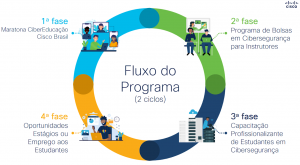 O Programa CiberEducação Cisco Brasil é dividido em diferentes fases e oferecerá formação profissional a estudantes, bem como a possibilidade de estágio. A primeira fase é a Maratona CiberEducação Cisco Brasil, um período de treinamento que visa estimular e capacitar alunos, ao longo de três semanas, no curso exploratório “Segurança de Endpoint”, através da plataforma Skills for All.