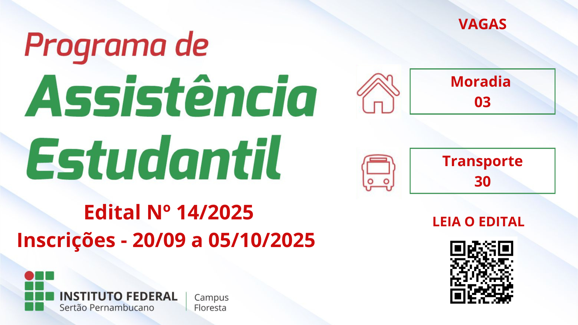 O campus Floresta do Instituto Federal do Sertão Pernambucano (IFSertãoPE) publicou, nesta segunda-feira (22), o edital n.º 14/2025, referente ao Programa de Assistência Estudantil para o semestre 2025.2. De acordo com o edital, os auxílios são destinados a estudantes regularmente matriculados em cursos presenciais das modalidades Ensino Médio Integrado, Subsequente, Proeja e Ensino Superior, prioritariamente em situação de vulnerabilidade socioeconômica.…