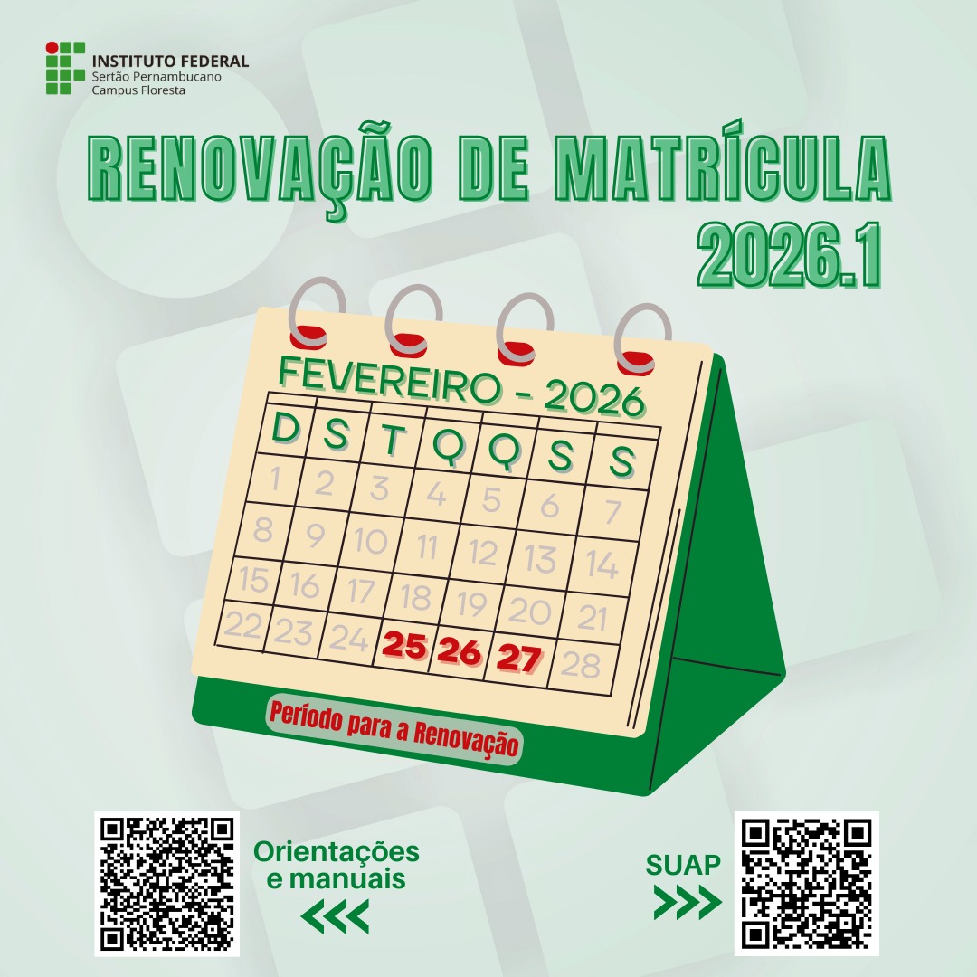 O campus Floresta do Instituto Federal do Sertão Pernambucano (IFSertãoPE) divulgou, nesta quinta-feira (12), o calendário de renovação de matrículas e de procedimentos acadêmicos para o semestre 2026.1. Compartilhar conteúdo: Facebook Twitter LinkedIn Pinterest WhatsApp