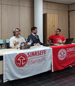 O objetivo do encontro foi dar seguimento ao diálogo entre a Gestão e o Sinasefe, a respeito do ponto eletrônico para os docentes da Carreira de Magistério do Ensino Básico, Técnico e Tecnológico (EBTT), no âmbito do IFSertãoPE. As tratativas mais recentes sobre o tema foram iniciadas pela Seção Sindical com o Ofício nº 15/2025/Sinasefe/ Seção Sindical/IFSertãoPE, na data de 16 de abril de 2025. No documento, o Sindicato solicita a suspensão do ponto eletrônico, tendo em vista o Termo de Acordo nº 10/2024, firmado em junho do ano passado ao fim da greve nacional dos servidores da educação federal. Também foram solicitados documentos legais que sustentam a manutenção do controle eletrônico de frequência na Instituição.