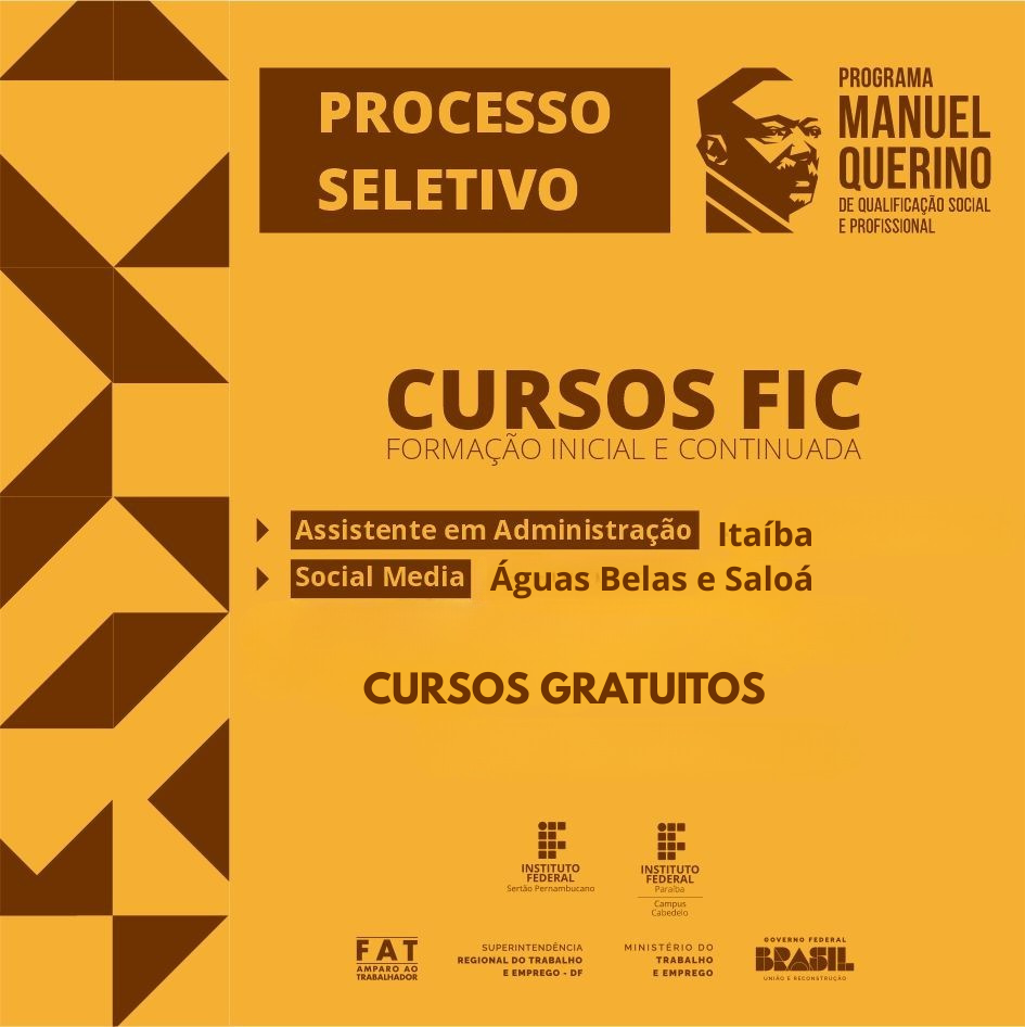 O Instituto Federal do Sertão Pernambucano (IFSertãoPE) lançou o Edital nº 158/2025 para a seleção de estudantes interessados nos cursos de formação profissional de Assistente em Administração e Social Media, nas cidades de Águas Belas, Itaíba e Saloá.