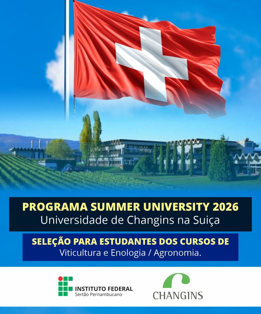 O Instituto Federal do Sertão Pernambucano (IFSertãoPE) anunciou, nesta sexta-feira (27), mais uma oportunidade de intercâmbio acadêmico para estudantes da instituição. Por meio do edital n.º 27/2026, a instituição irá selecionar até quatro estudantes – sendo dois do curso de Tecnologia em Viticultura e Enologia e dois do Bacharelado em Agronomia, do campus Petrolina Zona Rural – para participação no programa Summer University 2026, na Escola Superior de Viticultura e Enologia de Changins, localizada na Suíça. Os quatro estudantes selecionados realizarão um curso de verão no período de 29 de junho a 14 de julho de 2026, que será oferecido em língua inglesa pela instituição suíça.