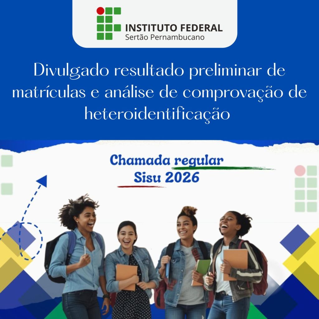 Nesta terça-feira (10), o Instituto Federal do Sertão Pernambucano (IFSertãoPE) divulgou o resultado parcial das matrículas e a análise de comprovação de heteroidentificação para a chamada regular do Sistema de Seleção Unificada (Sisu), edição 2026. Os candidatos deverão consultar este link, procurar as listas de resultado do seu respectivo campus e conferir se sua matrícula foi deferida.