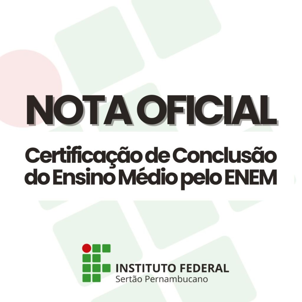O Instituto Federal do Sertão Pernambucano (IFSertãoPE) informa que consultou formalmente o Instituto Nacional de Estudos e Pesquisas Educacionais Anísio Teixeira (INEP) acerca da possibilidade de realizar a Certificação de Conclusão do Ensino Médio por meio do Exame Nacional do Ensino Médio (ENEM).