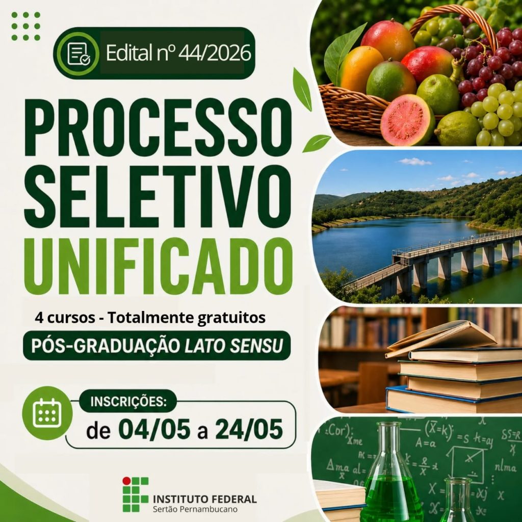 O Instituto Federal do Sertão Pernambucano (IFSertãoPE), por meio da Pró-Reitoria de Pesquisa, Inovação e Pós-Graduação (PROPIP), publicou o Edital nº 44/2026, que disciplina o Processo Seletivo Unificado para ingresso nos cursos de Pós-Graduação Lato Sensu na modalidade a distância. São ofertadas 140 vagas em quatro especializações, com ingresso previsto para o segundo semestre letivo de 2026. As inscrições são gratuitas e estarão abertas entre os dias 4 e 24 de maio, através deste formulário eletrônico.