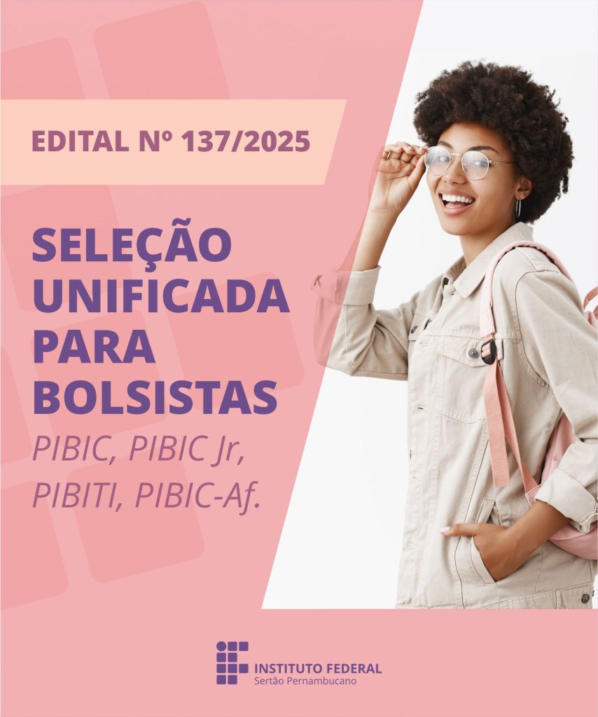 O IFSertãoPE, por meio da Pró-Reitoria de Pesquisa, Inovação e Pós-Graduação (Propip), anunciou na terça-feira (4) a abertura do edital n.º 137/2025, referente à seleção de bolsistas de iniciação científica e desenvolvimento tecnológico de todos os campi, para execução no período de março a outubro de 2026. O edital contempla bolsas para estudantes de graduação e ensino médio técnico, distribuídas entre as modalidades de iniciação científica (Pibic), iniciação científica júnior (Pibic Jr.) e inovação tecnológica (Pibiti), incluindo vagas reservadas para ações afirmativas nas três categorias (Pibic-Af, Pibic Jr-Af e Pibiti-Af).