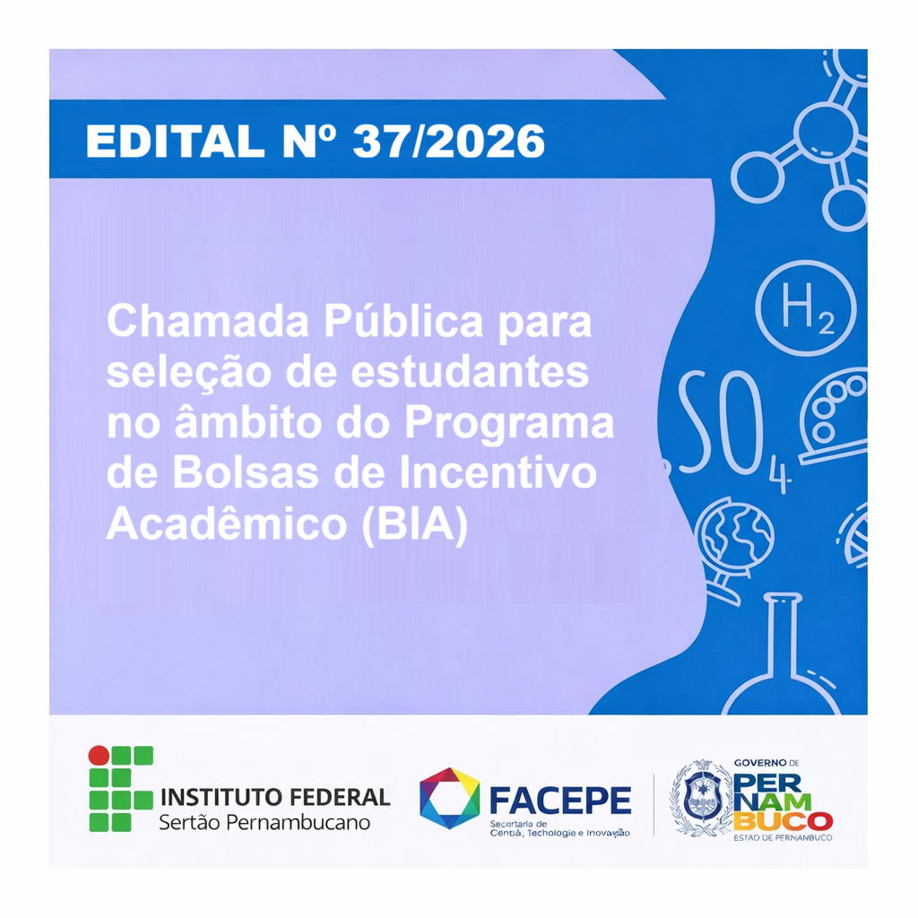 O Instituto Federal do Sertão Pernambucano (IFSertãoPE), por meio da Pró-Reitoria de Ensino (PROEN), da Pró-Reitoria de Pesquisa, Inovação e Pós-Graduação (PROPIP) e da Pró-Reitoria de Extensão e Cultura (PROEXT), lançou o Edital nº 37/2026, referente à Chamada Pública para seleção de estudantes interessados em participar de projetos de ensino, pesquisa e extensão no âmbito do Programa de Bolsas de Incentivo Acadêmico (BIA 2026).