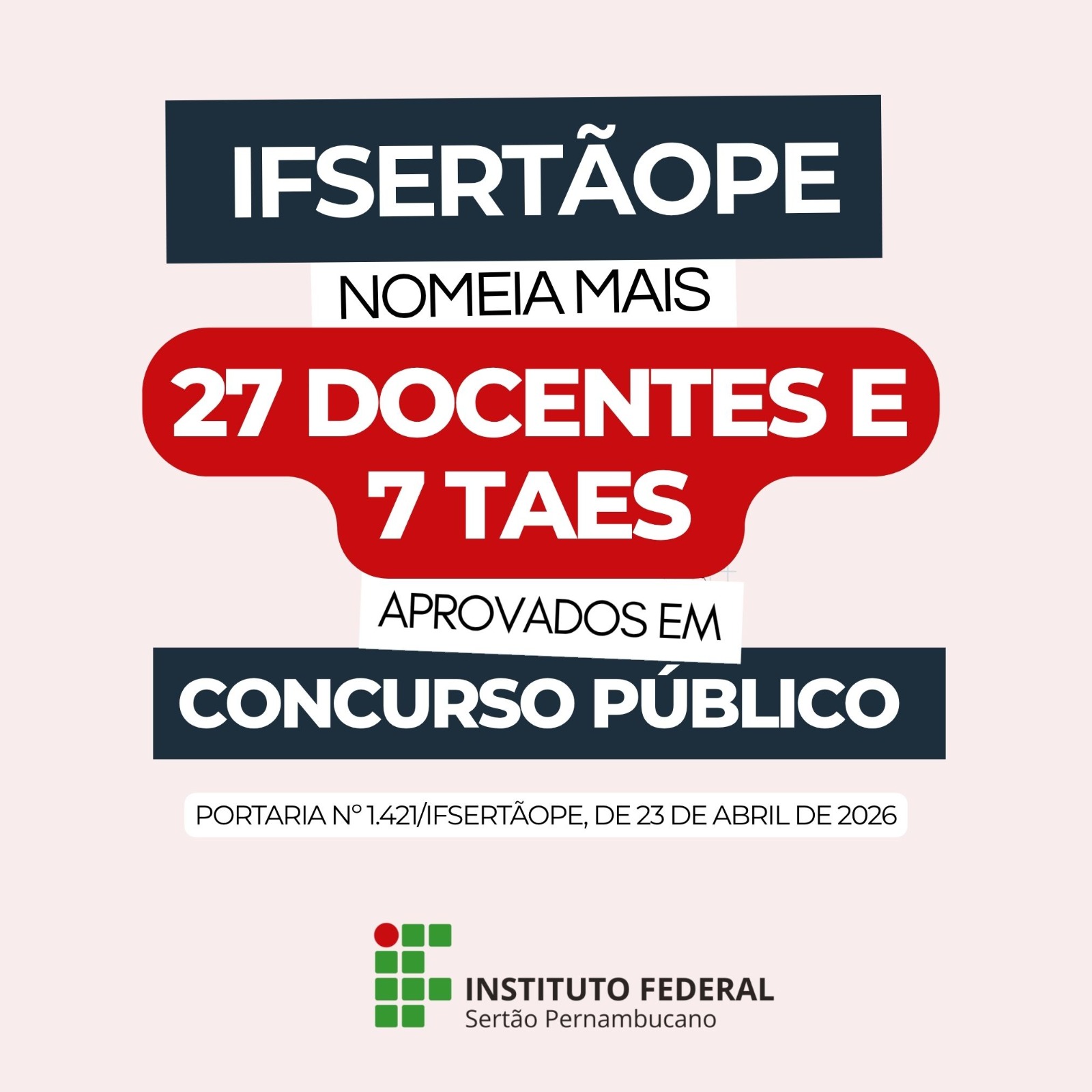 O Instituto Federal do Sertão Pernambucano (IFSertãoPE) publicou, no Diário Oficial da União desta quarta-feira (23), a nomeação de 34 novos servidores para compor o quadro da instituição. A medida contempla 27 docentes e 7 técnicos-administrativos em educação (TAEs), que irão atuar em diferentes campi. A portaria de nomeação pode ser consultada aqui.