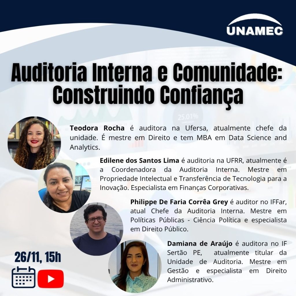 A live tem como objetivo ampliar a compreensão da comunidade sobre o papel da Auditoria Interna e fortalecer a relação entre os órgãos de controle e a sociedade. Para a auditora titular do IFSertãoPE, Damiana Araujo, a iniciativa contribui diretamente para o aperfeiçoamento institucional. “A abordagem do tema sob diferentes perspectivas e experiências permitirá aprofundar as reflexões sobre como a confiança mútua e a comunicação aberta são fundamentais para o aprimoramento dos processos institucionais. Quando a comunidade compreende o papel da Auditoria Interna e participa ativamente do diálogo, contribui para a construção de um ambiente mais colaborativo, transparente e orientado à entrega de melhores resultados para a sociedade”, avalia.