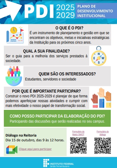 A participação de todos os servidores é de extrema importância para a elaboração do documento, por isso, a Diretoria de Organização Administrativa e Planejamento Estratégico (Doape) da Reitoria do IFSertãoPE convida a todos os servidores da unidade para participar da oficina virtual para elaboração do PDI 2025-2029, que será realizada no dia 15 de outubro, às 9h, por meio do link: meet.google.com/dfa-eonj-qet.