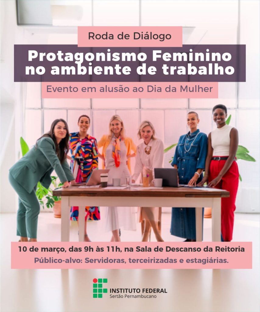 O Instituto Federal do Sertão Pernambucano (IFSertãoPE) realizará, na próxima terça-feira (10), a Roda de Diálogo “Protagonismo Feminino no Ambiente de Trabalho”. O evento será realizado das 9h às 11h, na Sala de Descanso da Reitoria, e é destinado a servidoras, terceirizadas e estagiárias lotadas no local. Não há necessidade de inscrição prévia
