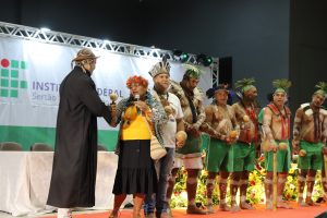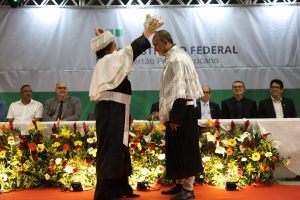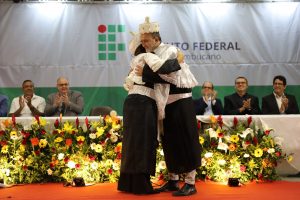 Na tarde de ontem (1º), o Instituto Federal de Educação, Ciência e Tecnologia do Sertão Pernambucano (IFSertãoPE) realizou, no auditório do campus Petrolina, a cerimônia de transmissão do cargo de Reitor, para o quadriênio 2024 a 2028. O evento teve início com a apresentação da Orquesta IFSertãoPE e também da “Dança dos Búzios: A arte do Bem Viver”, ritual apresentado por membros do Povo Indígena Pankararu do município de Jatobá (PE). Após o ritual, o reitor eleito do IFSertãoPE, Jean Carlos Coelho de Alencar, recebeu os cumprimentos e as bênçãos dos indígenas para sua gestão.