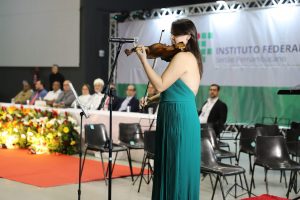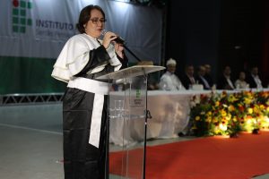 No momento de seu discurso, a ex-reitora Leopoldina Veras, emocionada, relembrou os desafios enfrentados ao longo dos oito anos de Gestão, agradecendo especialmente ao seu esposo, seu filho e suas filhas. A seguir, a professora do campus Ouricuri, Mayra Carmeli Maia Sales encantou os presentes com uma bela apresentação musical, que seguiu durante o momento de homenagens, em que Jean Carlos e Leopoldina Veras entregaram placas produzidas pelo LabMaker do campus Salgueiro, e certificados de honra aos homenageados que compuseram a Gestão no período de 2016 a 2024.