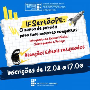 Nesta segunda-feira (4), o IFSertãoPE anunciou a publicação de dois editais destinados ao Processo Seletivo de estudantes para ingresso nos cursos técnicos da instituição, referentes ao ano letivo de 2026 (PS 2026). Ao todo, são oferecidas 1.736 vagas distribuídas em sete campi (Floresta, Ouricuri, Petrolina, Petrolina Zona Rural, Salgueiro, Santa Maria da Boa Vista e Serra Talhada), nas modalidades Integrado ao Ensino Médio, Proeja e Subsequente (Pós-Médio). As inscrições são gratuitas e estarão abertas no período de 12 de agosto a 17 de setembro de 2025, conforme retificação do cronograma publicada pela Pró-Reitoria de Ensino (Proen) nesta quinta-feira (7)*.