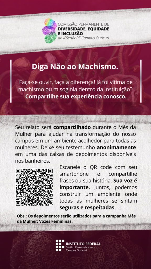 Com o objetivo de colher depoimentos de servidoras, funcionárias e alunas do Campus Ouricuri para a campanha “Mês da Mulher: Vozes Femininas”, a Comissão Permanente de Diversidade, Igualdade Racial e Inclusão disponibiliza um formulário eletrônico, bem como caixa de depoimentos que serão colocadas nos banheiros da unidade escolar. Os depoimentos serão coletados no período de 23 a 29 de fevereiro. O relato será compartilhado durante o Mês da Mulher. Link para o depoimento:https://forms.gle/CTU9urdpLQNYjhfV9.
