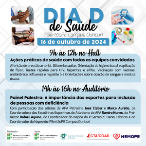 O campus Ouricuri do IFSertãoPE vai promover, no dia 16 de outubro de 2024,o Dia D da Saúde é uma atividade voltada para a promoção de hábitos saudáveis e para aumentar a conscientização sobre a inclusão de indivíduos com deficiência. O evento será dividido em duas etapas: pela manhã, ações práticas de saúde serão realizadas, e à tarde, um painel de discussão abordará o papel dos esportes na inclusão de pessoas com deficiência.