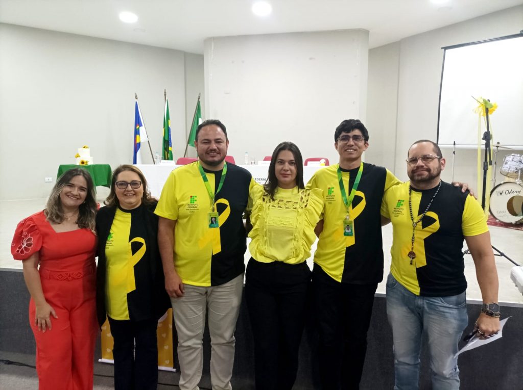 A imagem é uma fotografia de um grupo de seis pessoas, quatro homens e duas mulheres, posando juntas em um palco ou auditório decorado para a campanha Setembro Amarelo. Descrição do Grupo e Vestimentas: Quatro das pessoas (três homens e uma mulher) vestem camisetas que combinam as cores preto e amarelo, com um detalhe gráfico que remete ao laço do Setembro Amarelo ou a um logotipo do Instituto Federal (IF). Uma mulher à esquerda veste um conjunto de calça e blusa de manga bufante na cor vermelha alaranjada. Uma segunda mulher, ao lado da de vermelho, veste uma camiseta preta com detalhes em amarelo e o laço. Os homens vestem camisetas pretas e amarelas combinadas com calças em tons claros (cáqui ou jeans). Fundo da Cena: O grupo está em pé em um ambiente interno que parece ser um palco ou auditório. Ao fundo, vê-se: Uma mesa com toalha branca. Bandeiras (provavelmente do Brasil, de Pernambuco ou do IF). Um pequeno bolo de aniversário ou celebração. À direita, há um telão (parcialmente visível), um pedestal de microfone e equipamentos de som, incluindo um bumbo de bateria com a marca Odery, decorados com fitas amarelas.