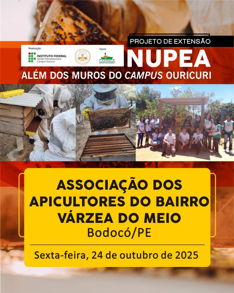 O Núcleo de Pesquisa e Extensão em Abelhas (NUPEA) do Campus Ouricuri do Instituto Federal do Sertão Pernambucano (IFSertãoPE), por meio do projeto de extensão “NUPEA, Além dos Muros do Campus Ouricuri” , vai promover, a partir das 8h30 da manhã da próxima sexta-feira, 24 de outubro, Dia de Campo em Abelhas, que será realizado na Igreja dos Santos Reis, localizada no bairro da Várzea do Meio, no município de Bodocó – PE.
