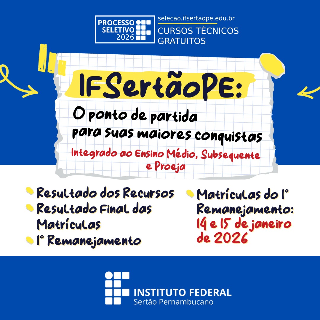 O Campus Ouricuri do Instituto Federal do Sertão Pernambucano (IFSertãoPE) divulgou, hoje (14), o 1° Remanejamento do Ensino Médio Integrado do Processo Seletivo 2026.