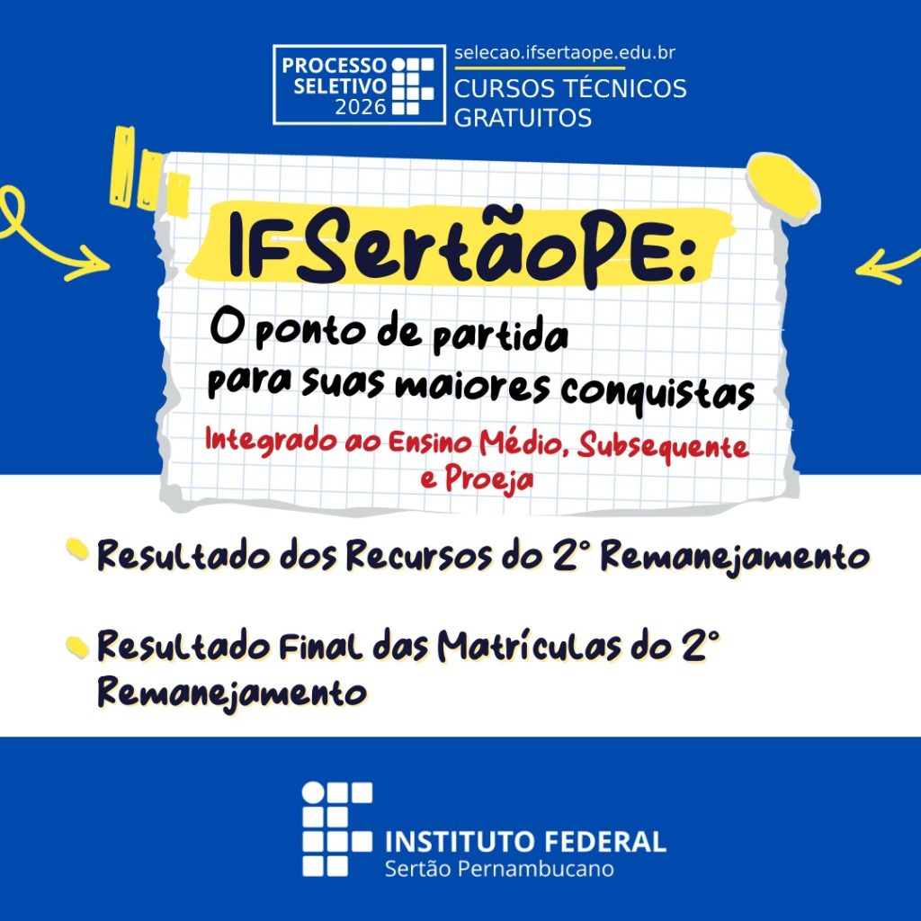 O Campus Ouricuri do Instituto Federal do Sertão Pernambucano (IFSertãoPE) divulgou, nesta quarta-feira (4), o resultado final das matrículas do 2º remanejamento para os cursos técnicos do Ensino Médio Integrado, referente ao Processo Seletivo (PS) 2026, regido pelo edital n.º 199/2025.