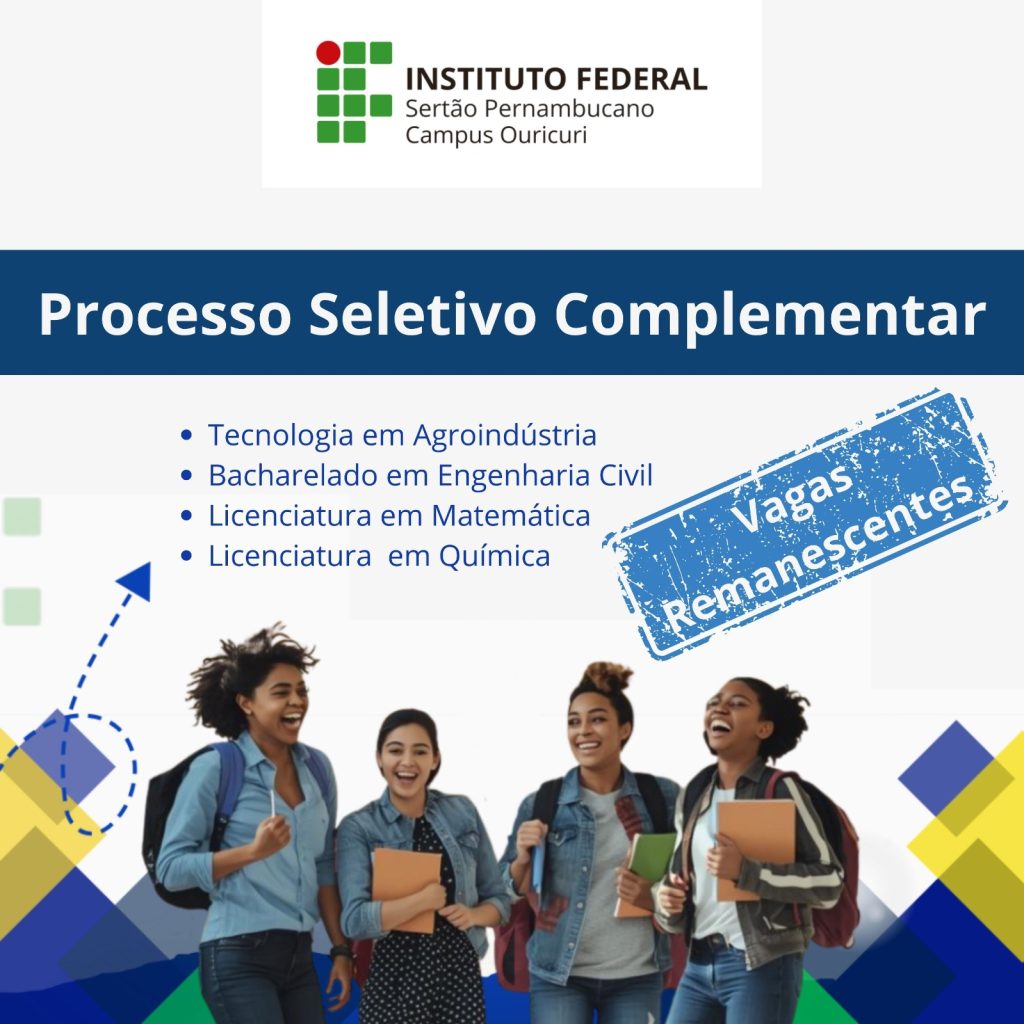 Card institucional do Instituto Federal do Sertão Pernambucano – Campus Ouricuri, com o logotipo no topo e o título “Processo Seletivo Complementar”. Abaixo, lista de cursos: Tecnologia em Agroindústria, Bacharelado em Engenharia Civil, Licenciatura em Matemática e Licenciatura em Química. À direita, um carimbo azul com a expressão “Vagas Remanescentes”. Na parte inferior, imagem de quatro estudantes sorrindo, com mochilas e cadernos nas mãos, sobre fundo com elementos geométricos nas cores azul, verde e amarelo.