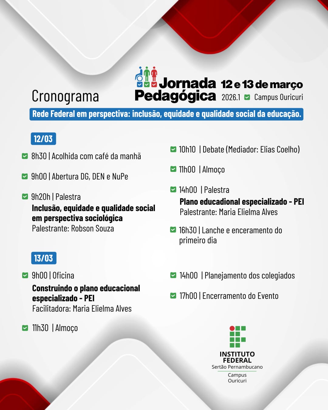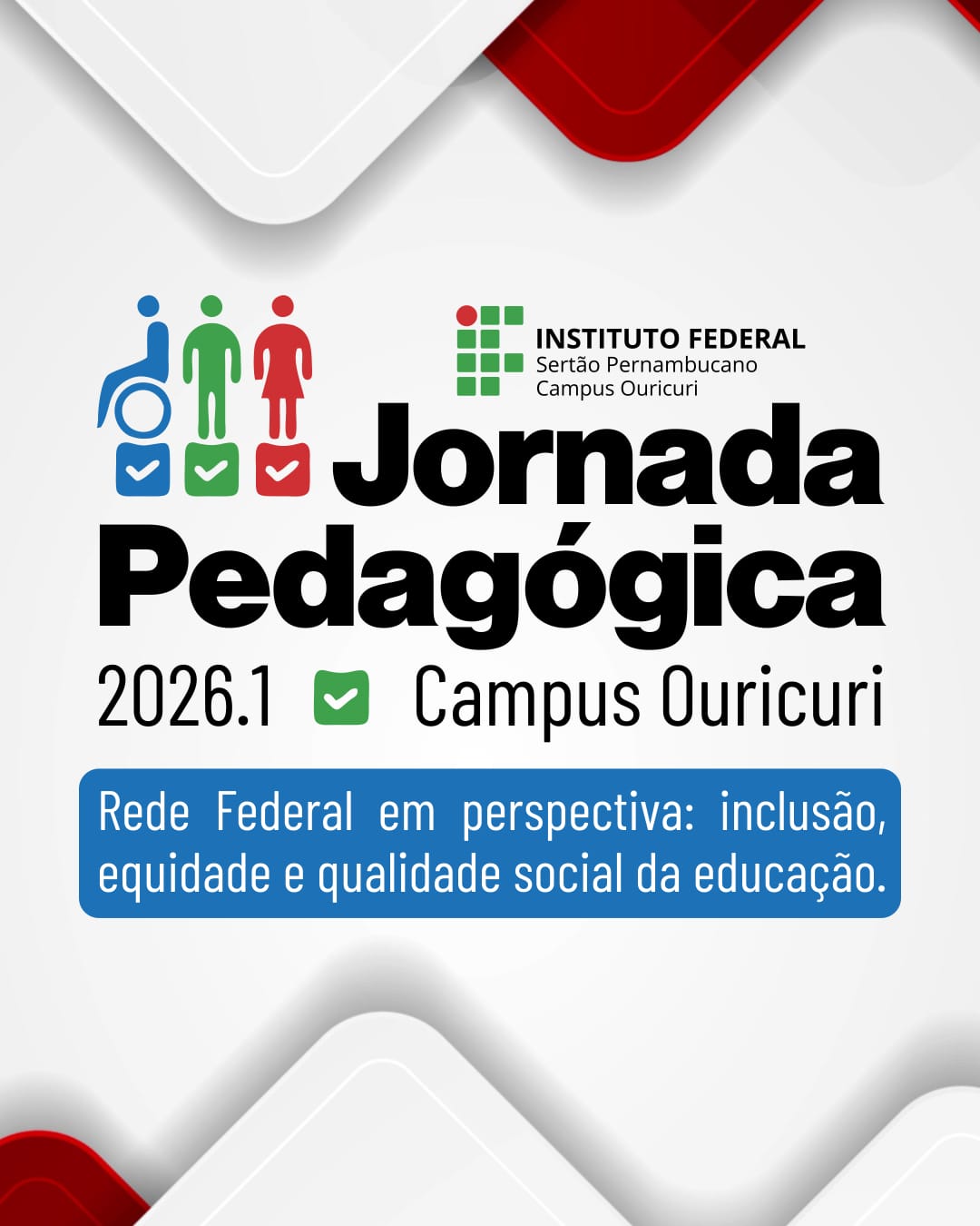 O Campus Ouricuri vai promover, entre os dias 12 e 13 de março, a Jornada Pedagógica 2026.1. Nesta edição, o evento terá como tema “Rede Federal em perspectiva: inclusão, equidade e qualidade social da educação”.