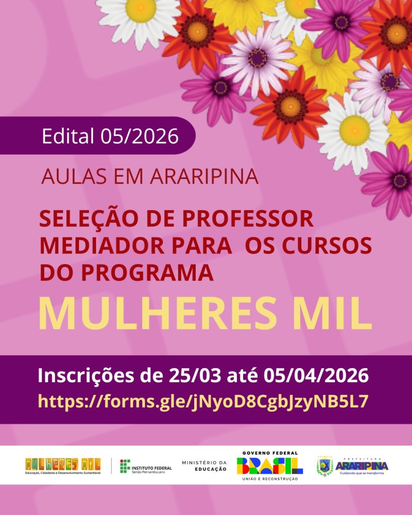 O Campus Ouricuri do Instituto Federal do Sertão Pernambucano (IFSertãoPE) publicou, nesta segunda-feira (23), o Edital nº 05/2026, o qual é referente ao processo seletivo simplificado com o objetivo de formar cadastro de reserva de bolsistas para atuação como professor mediador nos cursos de Formação Inicial e Continuada (FIC) do programa Mulheres Mil, que serão realizados em Araripina – PE.