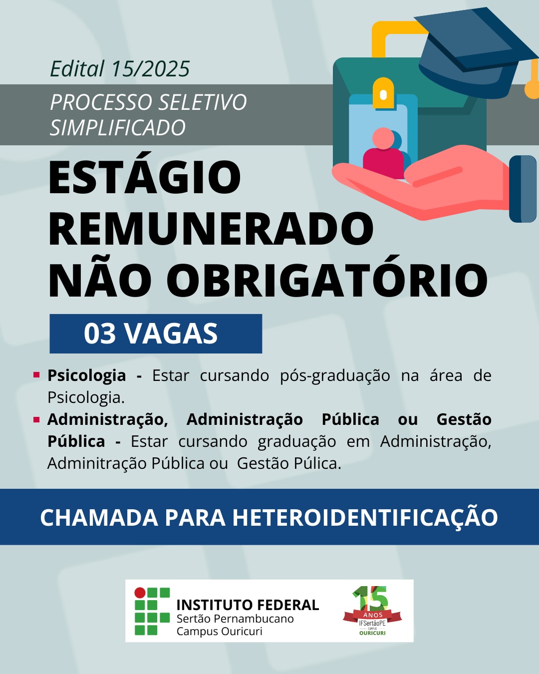 O Campus Ouricuri do IFSertãoPE publicou, hoje (22), a convocação dos candidatos inscritos como preto ou pardo para a realização do procedimento de heteroidentificação, referente ao processo seletivo simplificado para estágio remunerado não obrigatório (edital nº 15/2025). O prazo para o envio dos arquivos é de 24 a 25 de setembro. Clique aqui para ter acesso ao arquivo. Compartilhar conteúdo:…