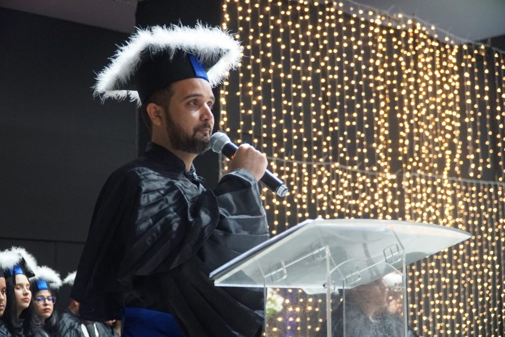 A cerimônia foi marcada pela emoção e pelo reconhecimento de trajetórias distintas, mas semelhantes em desafios e superações. Após os juramentos, oradores e oradoras revisitaram o início das jornadas acadêmicas e percalços encontrados nos caminhos. Um deles foi Ildemar Alcântara, orador da turma de Licenciatura em Música, que, com muita emoção, refletiu sobre a conquista. “Não é possível traduzir o que passamos nessa caminhada, que não foi fácil, mas que, com o apoio dos amigos, familiares e servidores, conseguimos trilhar. Saibam que na realização desse sonho há um pedacinho de cada um de vocês”, declarou.