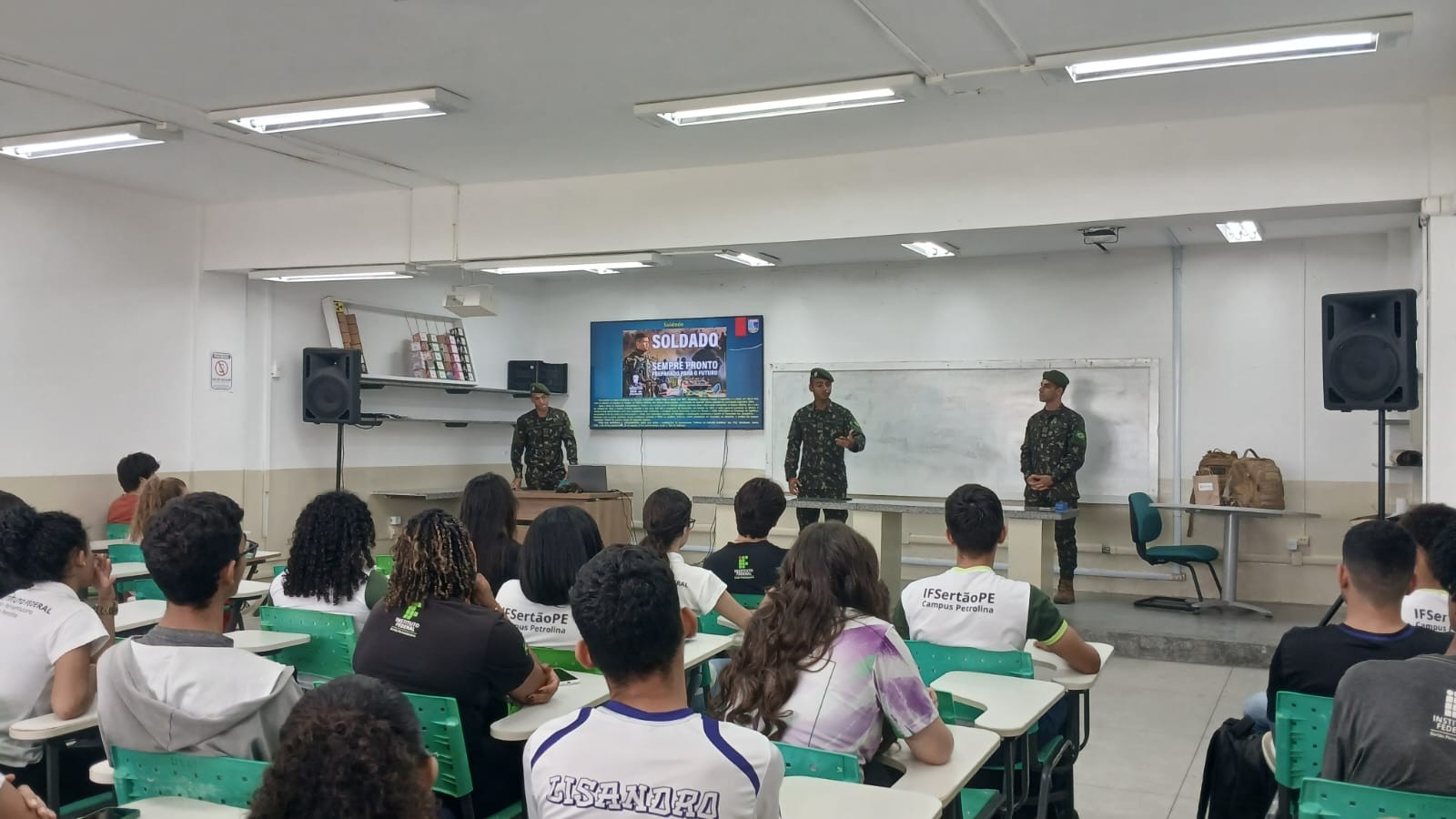 Estudantes do Ensino Médio Integrado do Campus Petrolina do IFSertãoPE participaram, na última terça-feira (14), de uma atividade formativa intitulada “Dia do Exército Brasileiro – A história do Exército”, conduzida pelos Aspirantes Ruaro, Victor Sales e Da Silva.