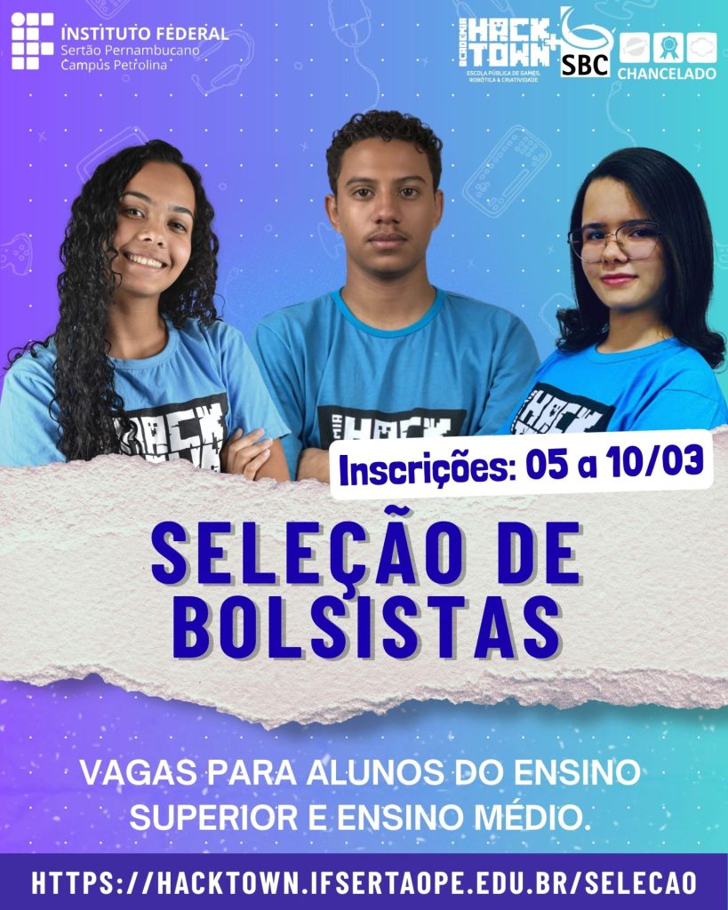 O campus Petrolina do Instituto Federal do Sertão Pernambucano (IFSertãoPE) lançou o Edital nº 06/2026, que regulamenta o processo seletivo para bolsistas da Academia HackTown+. As inscrições são gratuitas e devem ser realizadas de 5 a 10 de março de 2026, exclusivamente pelo formulário online disponibilizado aqui.