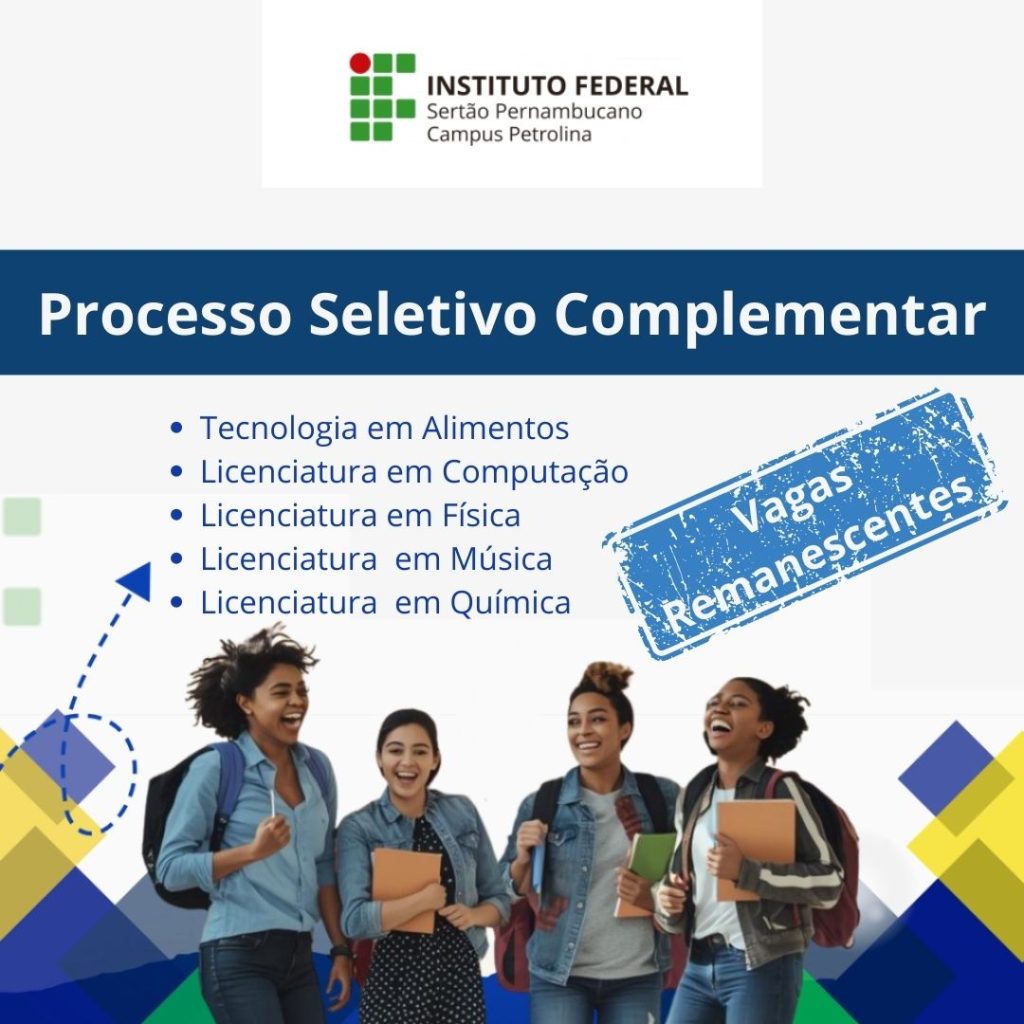 O campus Petrolina do Instituto Federal do Sertão Pernambucano (IFSertãoPE) informa que, no período de 27 de fevereiro a 8 de março de 2026, estão abertas as inscrições para o preenchimento de vagas remanescentes nos cursos superiores de Tecnologia em Alimentos e nas Licenciaturas em Computação, Física, Música e Química, com ingresso no primeiro e segundo semestres de 2026. Para concorrer às vagas disponíveis, os candidatos deverão preencher o formulário eletrônico disponível nesta página, desde que tenham participado de qualquer edição do Exame Nacional do Ensino Médio (Enem).
