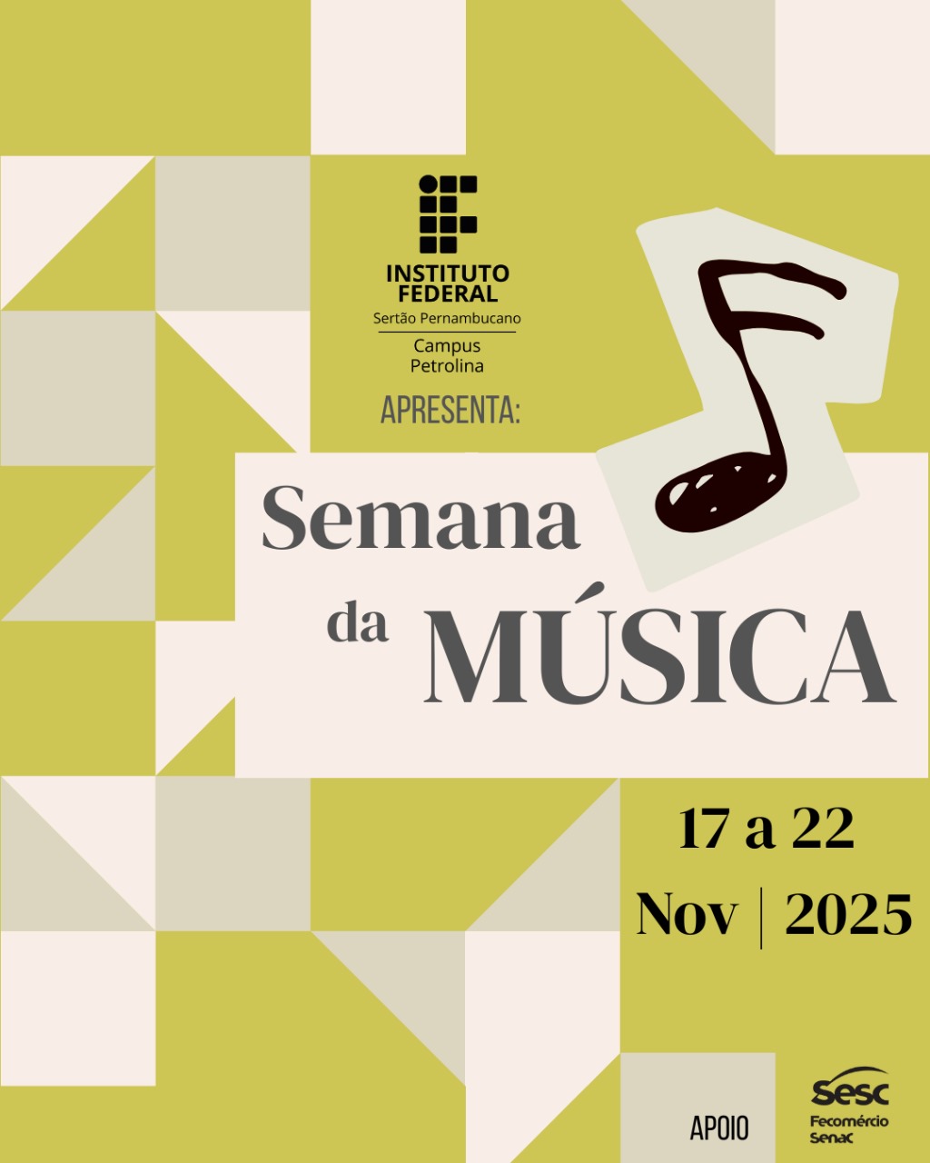 Entre os dias 17 e 22 de novembro, o Campus Petrolina do IFSertãoPE realizará a Semana da Música 2025, que levará ao Vale do São Francisco uma programação diversificada, totalmente aberta ao público, composta por recital, concertos, apresentações instrumentais e ensaios abertos. O evento destaca a produção artística e pedagógica do curso de Licenciatura em Música e reforça o compromisso da instituição com a democratização do acesso à cultura.