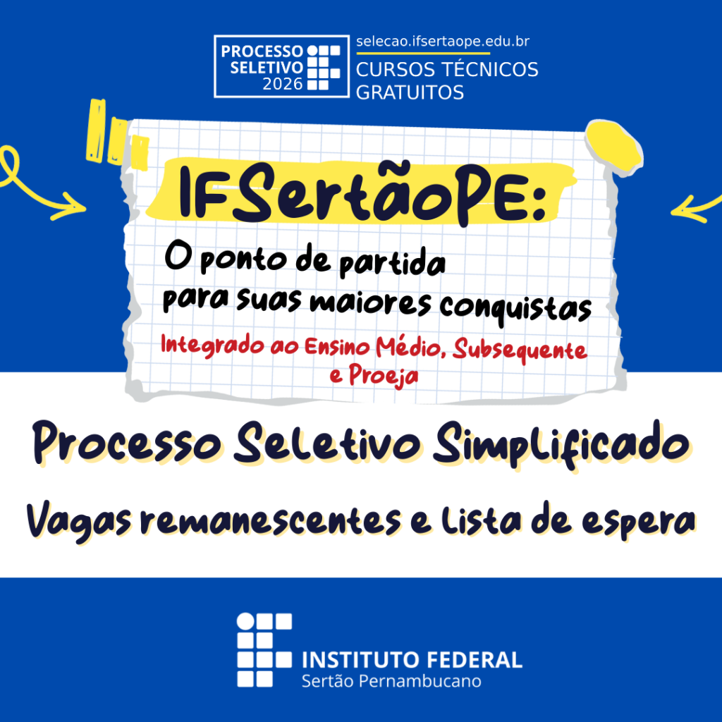 O campus Petrolina do IFSertãoPE divulgou o edital nº 04/2026, referente ao Processo Seletivo Simplificado para Preenchimento de Vagas Remanescentes e Lista de Espera do Edital Nº 102/2025, para o Curso Técnico Subsequente em Edificações, com ingresso no primeiro semestre de 2026 (início em 24 de fevereiro de 2026). As inscrições são gratuitas e serão realizadas online, por meio de formulário eletrônico.