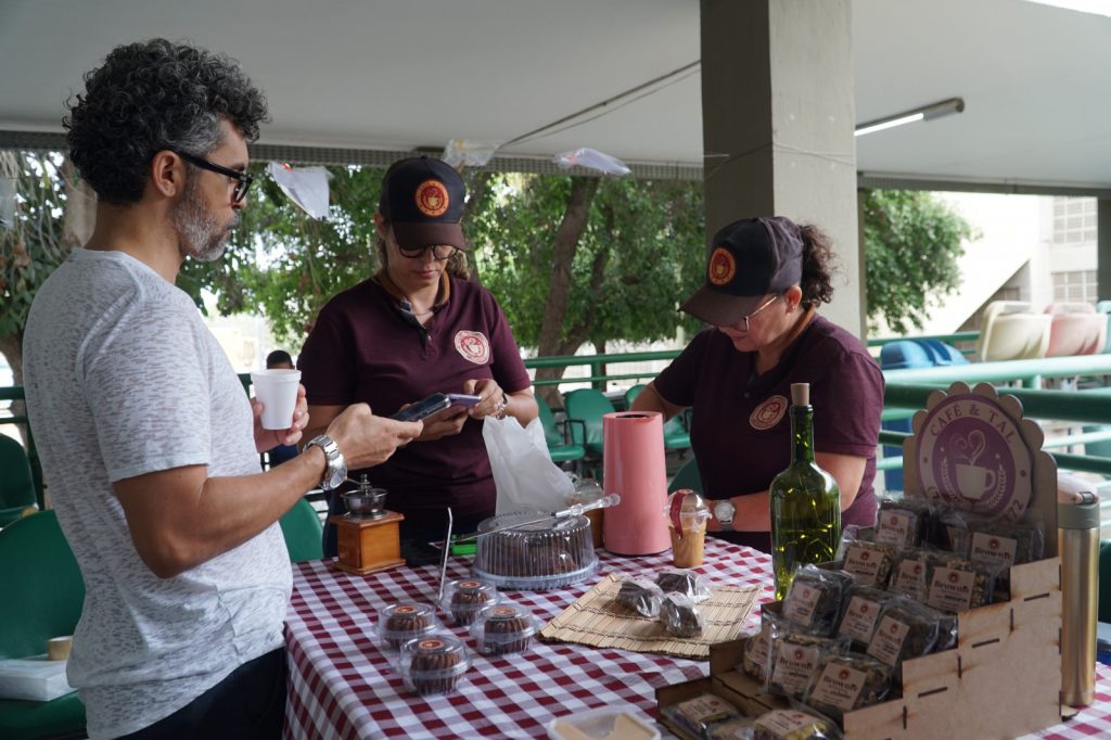 Outro exemplo de inovação veio das empreendedoras Gláucia Rabelo e Débora Silva, estudante da Licenciatura em Computação. Juntas, elas apresentaram uma linha criativa de produtos à base de café. “Temos creme, kits de café, chocolate com café e até pudins. Exploramos esse ingrediente para além da bebida. A ideia surgiu do nosso gosto por inventar”, explicou Gláucia. Ela também destacou a importância do evento: “Gostamos muito da Feira, é uma ótima oportunidade para mostrar nosso espírito empreendedor. Fiquei impressionada com o que os alunos criaram. Aqui temos espaço para ideias simples se tornarem grandes empreendimentos.”