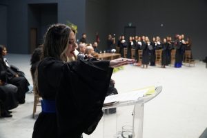 Para oradora do curso de Licenciatura em Química, Ane Beatriz Andrade, com a pandemia da Covid-19, que assolou o mundo de 2020 a 2022, a jornada acadêmica tornou-se ainda mais desafiadora. “Chegar aqui não foi nada fácil. A crise sanitária, que impôs o ensino remoto emergencial, foi um grande desafio que conseguimos transpor. Mesmo exaustos e com outros obstáculos, precisávamos continuar caminhando. Mas, com o esforço individual e apoio dos professores, familiares e amigos, estamos aqui pra concluir esta etapa”, pontuou.