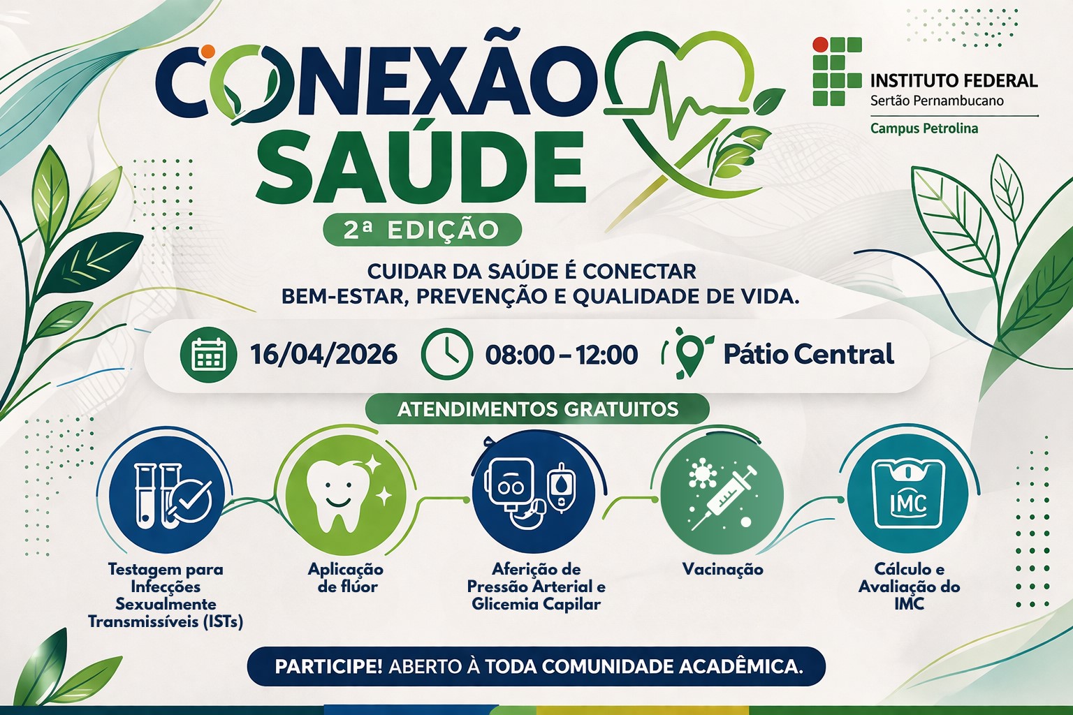O Campus Petrolina do Instituto Federal do Sertão Pernambucano (IFSertãoPE) realizará, no próximo dia (16), a 2ª edição do evento Conexão Saúde. A ação acontecerá das 8h às 12h, no pátio central, e será voltada para toda a comunidade acadêmica.