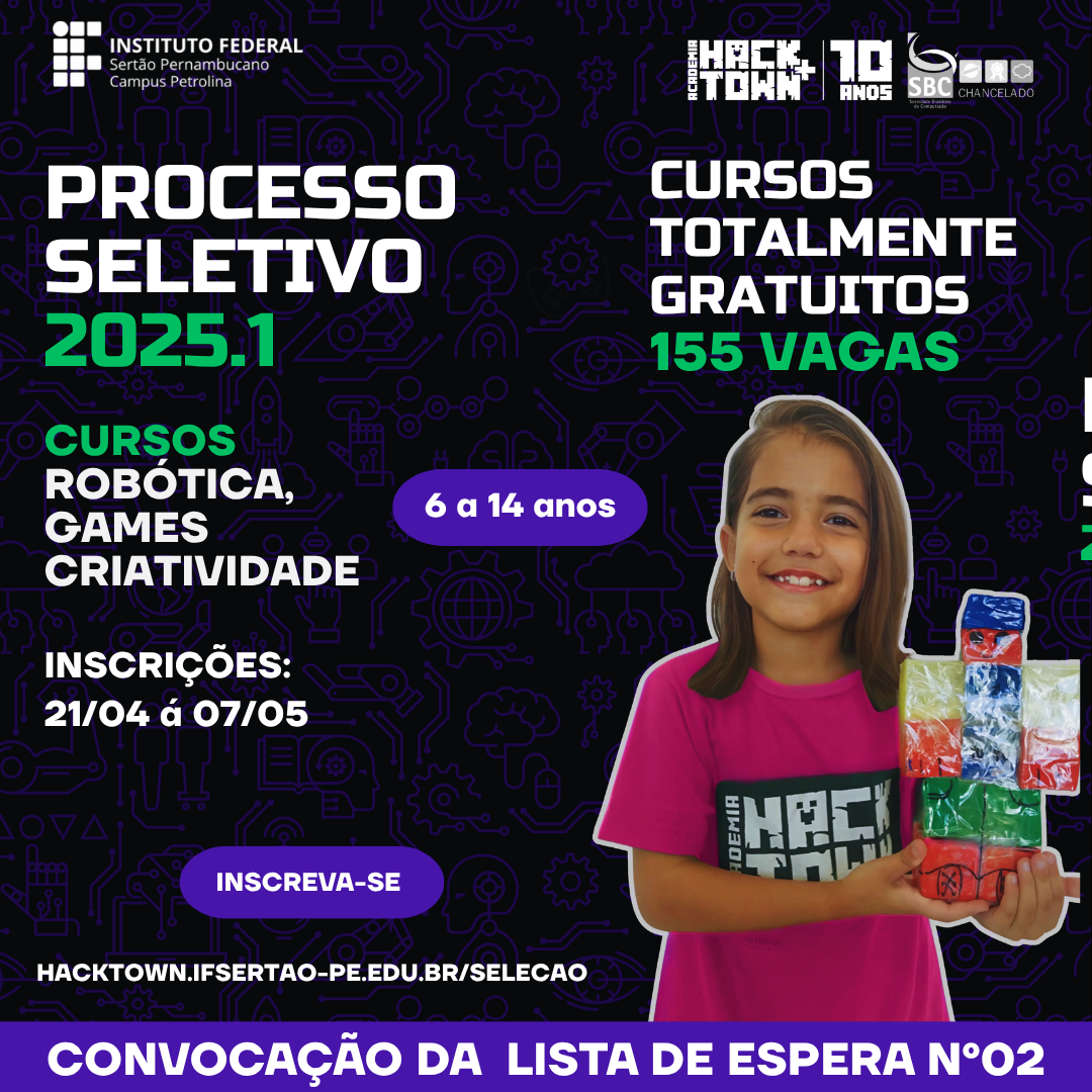 O Instituto Federal do Sertão Pernambucano (IFSertãoPE), através da Academia Hacktown, publicou o edital n.º 24/2025, com as regras para a seleção de participantes para cursos gratuitos de programação em games, robótica e criatividade. As vagas são voltadas para crianças e adolescentes, com idade entre seis e 12 anos. As inscrições são gratuitas e devem ser feitas entre os dias…