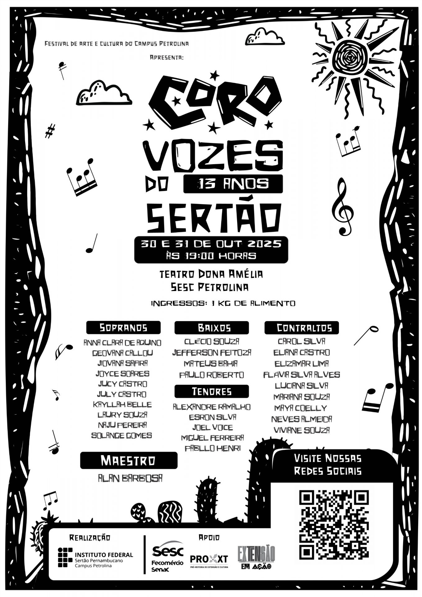 O Coro Vozes do Sertão do IFSertãoPE comemora 13 anos de trajetória com um espetáculo especial que celebra a poesia, a musicalidade e a riqueza cultural do sertão nordestino. As apresentações acontecem nos dias 30 e 31 de outubro, às 19h, no Teatro Dona Amélia (SESC Petrolina). O evento é gratuito e aberto ao público em geral, com entrada mediante a doação de 1kg de alimento não perecível, que poderá ser entregue uma hora antes do espetáculo.