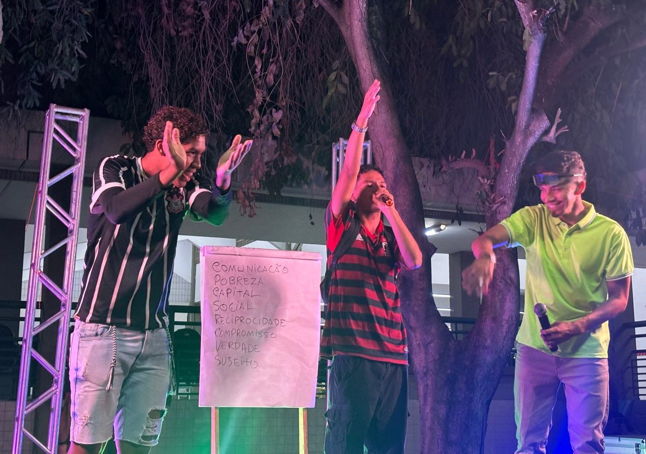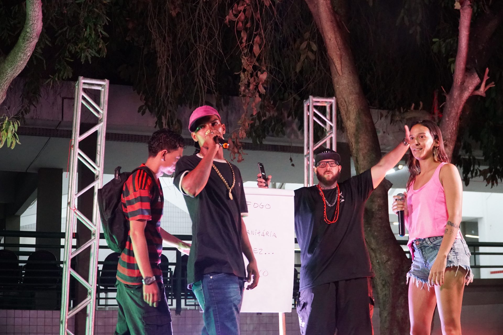 Na sequência, a criatividade e o debate social tomaram conta do pátio do Festival com a Batalha do Conhecimento, que mobilizou MCs da região em duelos de rimas improvisadas. Por meio da arte, os participantes refletiram sobre questões sociais, políticas e culturais. A plateia, junto aos jurados, avaliou as apresentações, criando um ambiente de troca, engajamento e pertencimento.