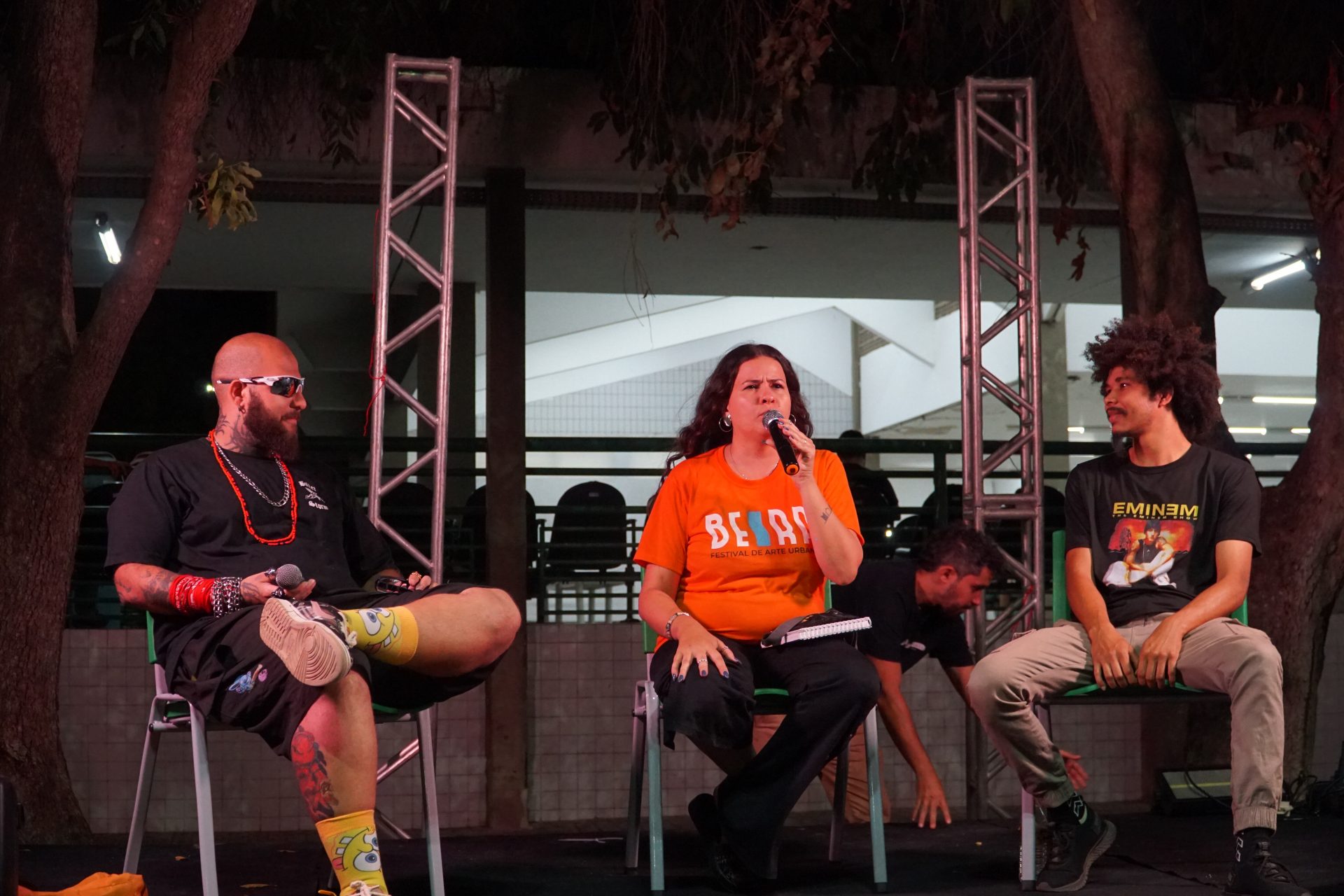 A programação também trouxe o Bate-papo sobre Arte Urbana, reunindo Lys Valentim, o rapper GG do Apocalipse e o dançarino Nattan B-Boy. O diálogo abordou temas como a ocupação do espaço urbano, a construção de identidade e o papel da arte na transformação social, especialmente junto à juventude periférica.