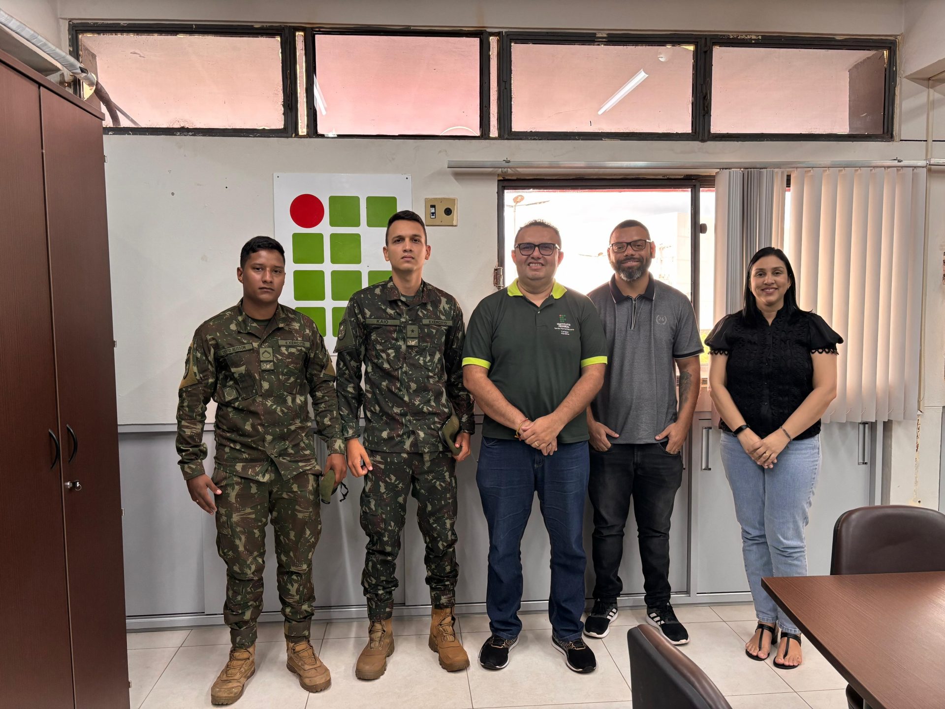 Participaram da reunião o diretor-geral do Campus Petrolina, professor Clésio Jonas, a coordenadora do curso de Tecnologia de Alimentos, professora Ana Júlia, o coordenador de Estágios e Egressos, Jamille Anderson, além dos representantes do Exército Brasileiro, Kaio e David.